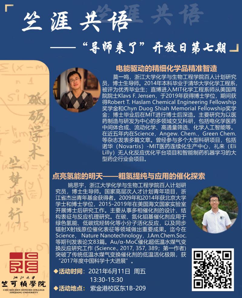 各位同学,竺涯共语“导师来了”开放日第七期将于6月11日(周五)下午13:30-15:30于紫金港东1B-209举行。本期嘉宾为来自浙大化学与生物工程学院百人计划研究员莫一鸣老师和姚思宇老师(老师们学生时期是清华北大的专业学霸哦)