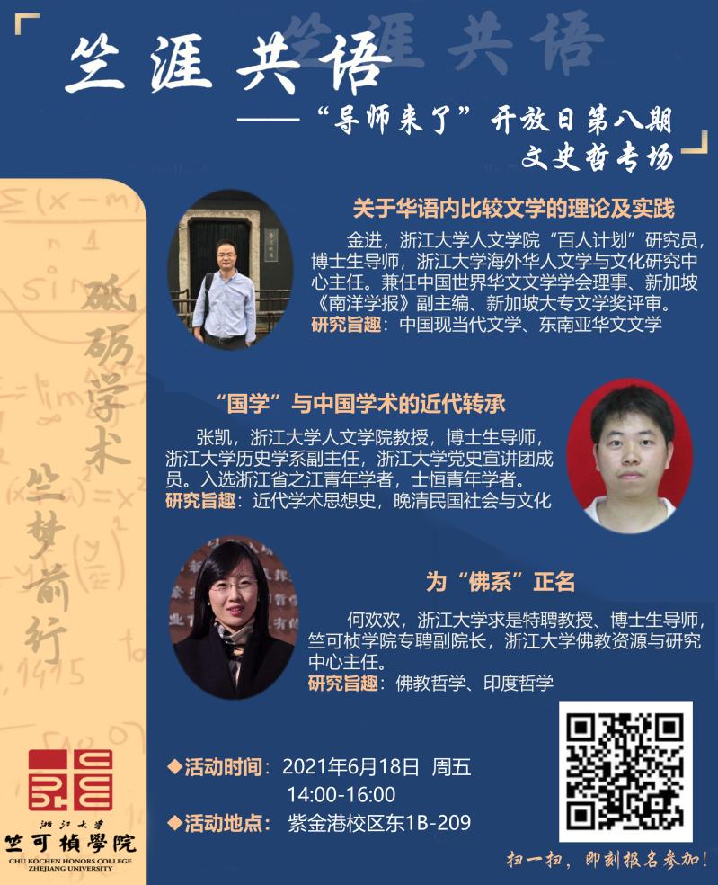 各位同学,竺涯共语“导师来了”开放日第八期将于6月18日(周五)下午14:00-16:00于紫金港东1B-209举行。本期嘉宾为来自浙大人文学院的金进老师、张凯老师、何欢欢老师。三位老师将分别以《关于华语内比较文学的理论及实践》《“国学”与中国学术的近代转承》《为“佛系”正名》的主题进行分享,一同感受文史哲学术盛宴。