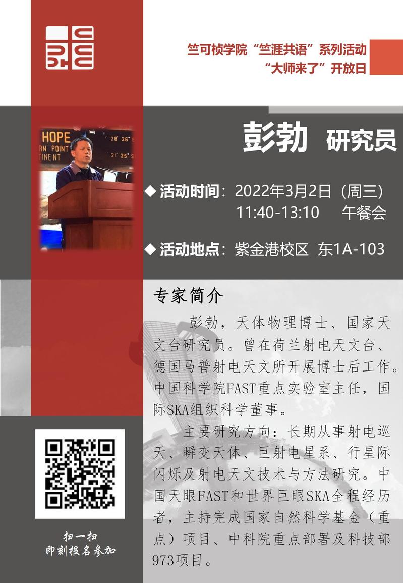 各位同学,竺涯共语“大师来了”开放日彭勃研究员午餐交流会将在2022年3月2日(周三)中午11:40-13:10在紫金港校区东1A103会议室举行。感兴趣的同学请于3月1日(周二)晚21点前扫描海报二维码或点击表单链接进行报名,我们会结合问卷填写内容和报名情况确定参与同学并短信与钉钉建群通知